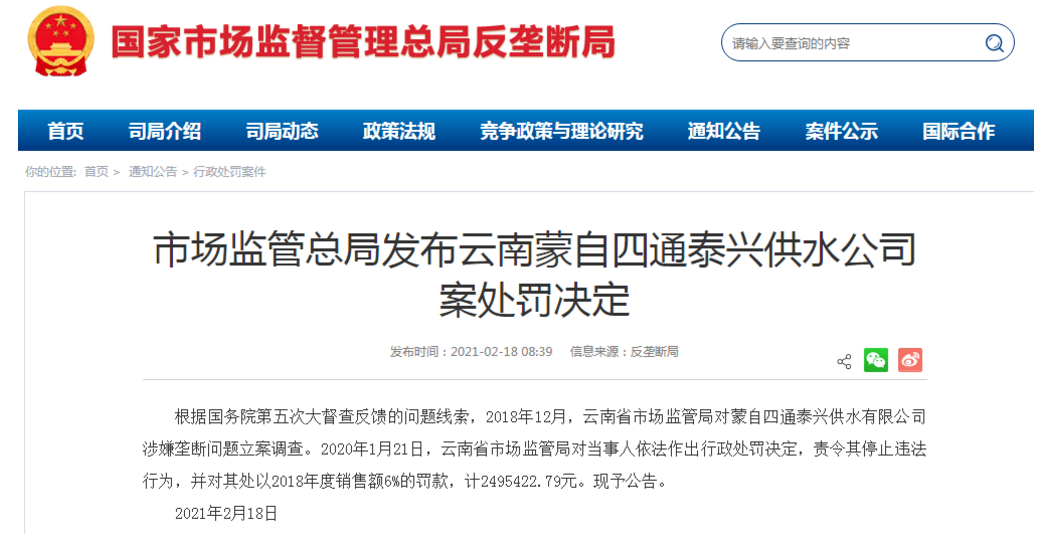 根據國務院第五次大督查反饋的問題線索,2018年12月,云南省市場監管局對蒙自四通泰興供水有限公司涉嫌壟斷問題立案調查。2020年1月21日,云南省市場監管局對當事人依法作出行政處罰決定,責令其停止違法行為,并對其處以2018年度銷售額6%的罰款,計2495422.79元。