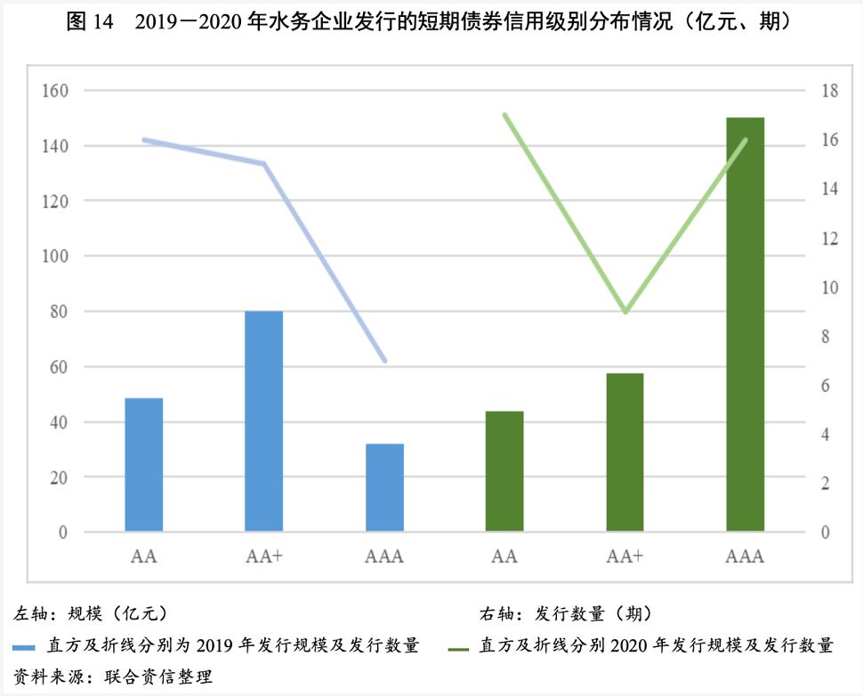 2020年,水務企業短期債券發行期數及規模繼續上升,各級別發行主體中,aa級主體發債期數仍然最多,發行規模延續了向高級別集中的趨勢。