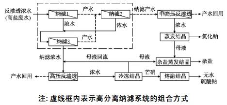 由圖1可知:高鹽廢水首先進入高分離納濾系統(tǒng)進行分鹽處理,通過納濾對高鹽廢水中的cl-和so2-4實現(xiàn)有效分離。然后,納濾系統(tǒng)產(chǎn)水進入中/高壓反滲透系統(tǒng)進行脫鹽和濃縮處理,反滲透產(chǎn)水進行回用,反滲透濃水進入蒸發(fā)結(jié)晶系統(tǒng)生成nacl;納濾系統(tǒng)濃水進入另一套高壓反滲透系統(tǒng)進行脫鹽和濃縮處理,反滲透產(chǎn)水進行回用,反滲透濃水進入冷凍結(jié)晶系統(tǒng)產(chǎn)出芒硝(naso4·10h2o),芒硝再通過熔融結(jié)晶系統(tǒng)產(chǎn)出無水na2so4。蒸發(fā)結(jié)晶和冷凍結(jié)晶系統(tǒng)的母液進入雜鹽蒸發(fā)結(jié)晶系統(tǒng)產(chǎn)出少量雜鹽,同時一部分冷凍結(jié)晶母液回流至高壓反滲透系統(tǒng)前端,與納濾系統(tǒng)濃水混合后實現(xiàn)循環(huán)處理。