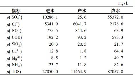 該工程于2018年12月底通水,穩(wěn)定運行3個多月后開始連續(xù)取樣并進行水質(zhì)監(jiān)測,監(jiān)測時間區(qū)間為2019-03—12,監(jiān)測期間進水水質(zhì)如表2所示。可見:監(jiān)測期間項目進水水質(zhì)波動幅度很大,進水tds濃度高,且主要組分為na+、so2-4和cl-,進水no-3濃度較高;由于前端的中水回用系統(tǒng)設(shè)置了預(yù)處理裝置,所以進水硬度較低。