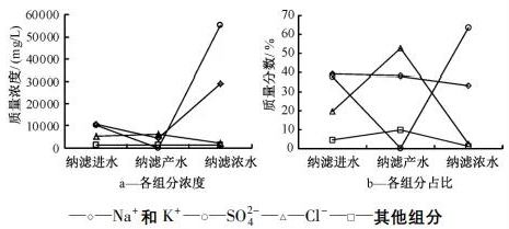 納濾系統(tǒng)進水、產(chǎn)水和濃水中各組分平均濃度如圖4所示。
