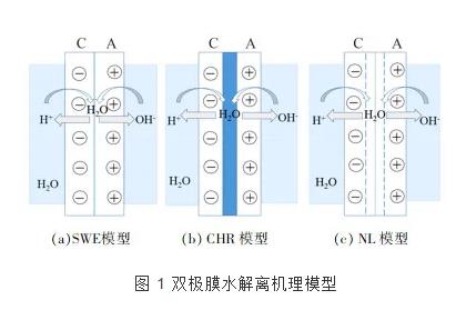 然而雙極膜中發生的水解離現象不同于通常的水解離,研究者們對其解離的過程機理開展了大量的理論研究,但限于過程的復雜性,目前還沒有達成統一的結論。根據水在雙極膜中間層解離過程的不同,主要提出3種解釋水解離機制的物理模型,見圖 1。