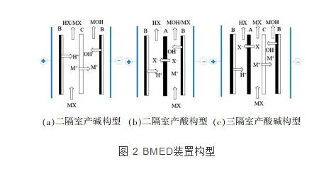 bpm與aem、cem組成的bmed的裝置構型從簡單的二隔室發展為三隔室,由b-c-b或者b-a-b組合成的二隔室和由b-a-c-b構成的三隔室bmed。見圖 2。