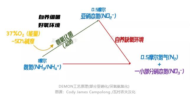 為什么要選擇進行部分反硝化的反應呢?請大家先再看一眼上邊的圖片:部分亞硝化/厭氧氨氧化(partial nitritation-anammox)除了能將亞硝酸鹽和氨氮轉化成氮氣之外,還不可避免地生成硝酸鹽。