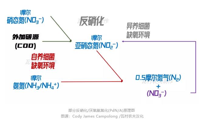 由于這些剩余的總無機氮主要為硝酸,如何去除這些硝態氮呢?聯合團隊想到了這么一個辦法:他們根據化學計量的數據,投加合適的外加碳源,將硝酸鹽轉化為亞硝態氮,然后再結合等量的剩余氨氮,通過anammox菌將兩者轉化成氮氣。雖然這個過程依舊會生產新的硝酸鹽,總量已經大大降低,而且這些新生成的硝酸鹽最終也可以進入反硝化反應。