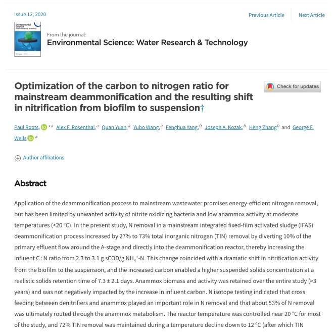目前他們已經有一些發表的論文成果,例如下邊這篇文章,他們發現改良碳氮比的過程還伴隨硝化反應從生物膜轉移到懸浮液相中。這一個個的小發現都會幫助研究人員加深對pdn/a工藝關鍵控制和潛在機制的理解。