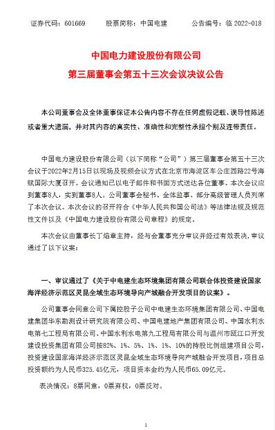 近日,中國(guó)電建發(fā)布公告稱,公司審議通過(guò)了《關(guān)于中電建生態(tài)環(huán)境集團(tuán)有限公司聯(lián)合體投資建設(shè)國(guó)家海洋經(jīng)濟(jì)示范區(qū)靈昆全域生態(tài)環(huán)境導(dǎo)向產(chǎn)城融合開(kāi)發(fā)項(xiàng)目的議案》。